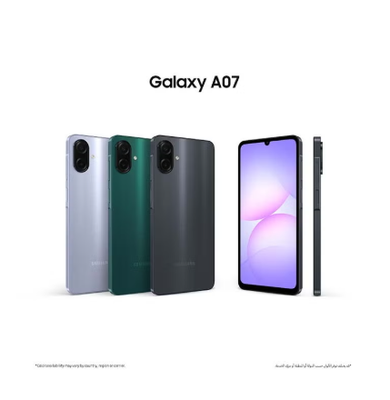 1. Color availability may vary by country, region or carrier.2.Available memory/storage capacity is subject to pre-installed software.3.Memory/storage options and availability may vary by country, region or carrier.4.Image simulated for illustrative purposes.5.Galaxy A07 will be supported with six generations of OS upgrades and six years of security updates from the first global launch date.6.Image simulated for illustrative purposes.7.The OS upgrade and security update policies specified above are subject to change.8.Actual product may differ from the image shown.9.Image simulated for illustrative purposes.10.Galaxy A07 is rated as IP54. Based on lab test conditions, the device is sprayed by 10 liters of fresh water per minute for 5 minutes atall angles. Not advised for beach or pool use. Water and dust resistance of device is not permanent and may diminish over time due tonormal wear and tear.11.Actual product may differ from the image shown.12.Images simulated for illustrative purposes.13.Measured diagonally, the screen size is 6.7" in the full rectangle and 6.6" accounting for the rounded corners. Actual viewable area isless due to the rounded corners and the camera cutout.